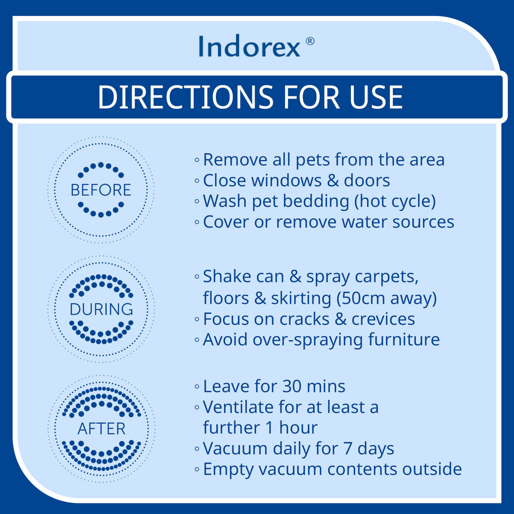 Indorex kills adult fleas and house dust mites on contact up to 2 months after application, thanks to its unique adulticide formulation, and prevents the development of flea eggs and larvae for up to 12 months.